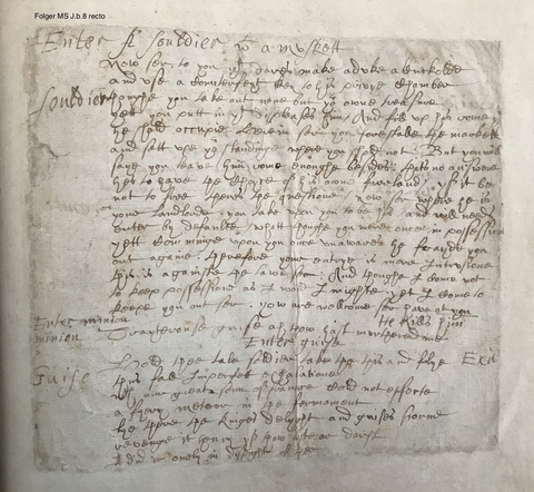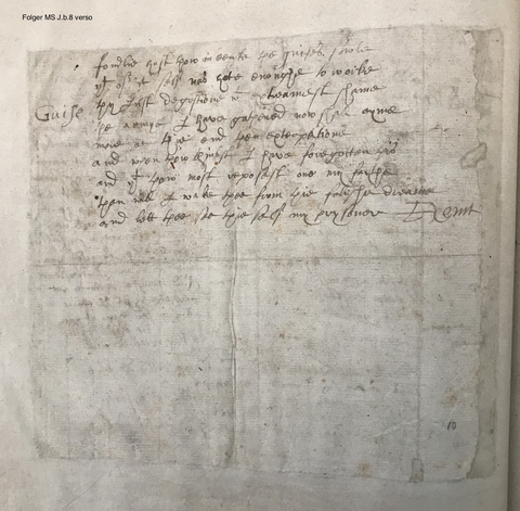Folger Shakespeare Library MS J.b.8 is a single leaf with a handwritten fragment from Massacre at Paris. The only surviving printed version of the play is short, and often considered to be memorial reconstruction (see Maguire); the manuscript, while written not by Marlowe (CELM), offers a longer version of one scene of the play. Laurie Maguire points to this manuscript as part of the proof that the printed version of The Massacre at Paris ([1596]) is a memorial reconstruction, that is, it was pieced together by actors from memory (Shakespearean Suspect Texts, 281; “Marlovian texts,” 44-47).