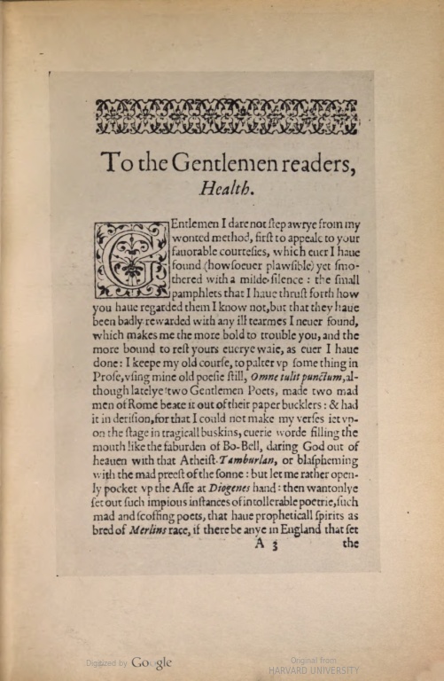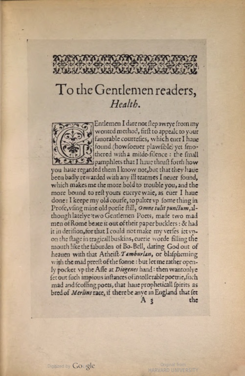 Greene’s prefatory letter “To the Gentlemen Readers, Health” (sig. A3-A3v) includes an extensive discussion of Marlowe: