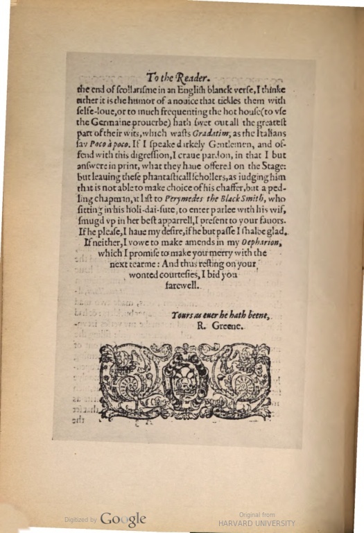 The title page of Perimedes the Blacksmith presents it as a didactic text offering exempla to be imitated: “A golden method, how to use the mind in pleasant and profitable exercise: Wherein is contained special principles fit for the highest to imitate, and the meanest to put in practice.” Greene envisioned a wide audience for his readership, from the highest class to the lowest; as he writes in his dedication to Gervase Clifton, he published this book with the classical Horatian goals to “profit” and “please” his readers. While we do not have any evidence about the early reception history of Perimedes the Blacksmith, we can only assume that Greene would be sour to learn that his book is remembered today only because he wrote about Christopher Marlowe.
